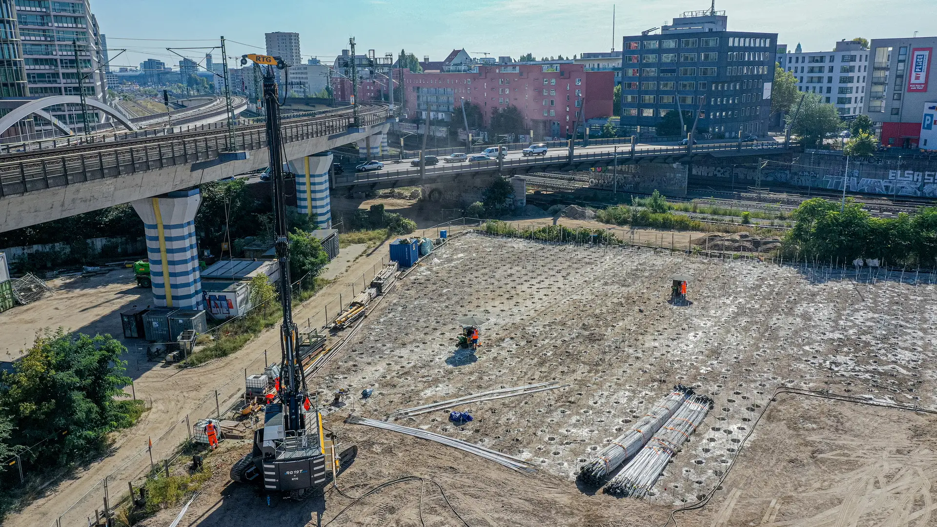 The operation at Friedrich-Krause-Ufer has been running at full speed since the end of July. And the conditions are far from easy: Confined site conditions in an urban setting surrounded by a railroad area and highly sensitive old buildings in the immediate vicinity. Access to the site via a narrow approach road is restricted. But the construction site team is on top of even the most challenging conditions. The first construction phase has already been finished, and the second phase was near 50% completion as of October. Step by step, the foundations for the future are created – robust, low-emission and efficient.
